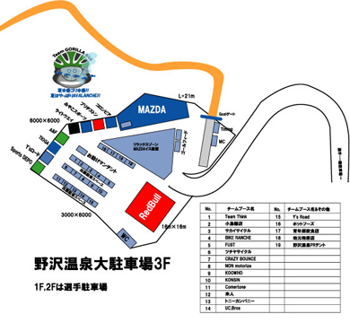 駐車場はパーティ会場のアリーナから少し進んだ右手長坂ゴンドラ手前の大駐車場をオープンしております。
